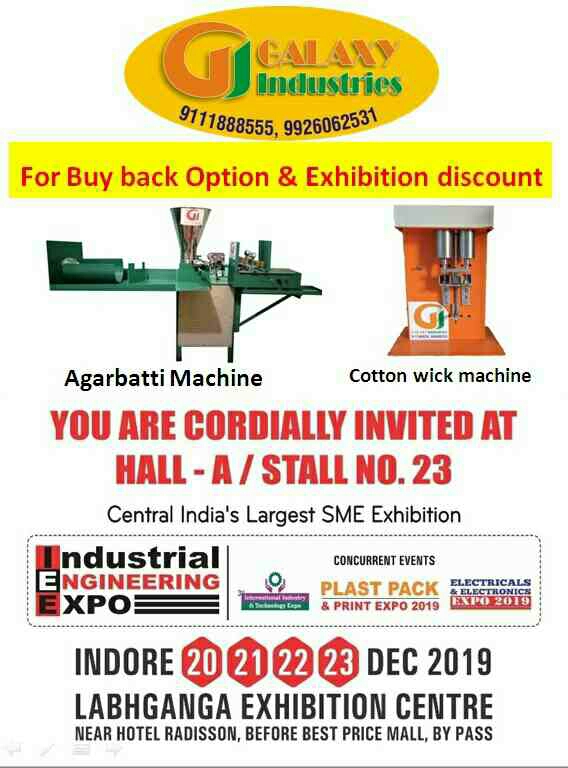 Welcomes, we are pleasure to invited you for our upcoming central india's largest SME exhibition ....... Hall -A /stall no.23.... Galaxy industries indore ....for buyback option $ exhibition discount..... Date-20, 21, 22, 23 dec 2019 Venue-labhganga exhibition center..... Adress-near Hotel Radisson, before best price mall, By Pass
